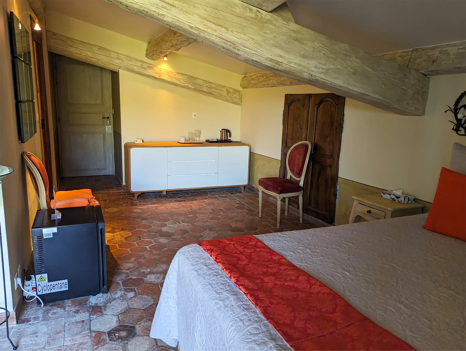 La suite « Les Coqs » vous propose un vaste espace. Cette grande chambre mansardée qui comprend un dressing, s’ouvre sur les restanques d’Oliviers.