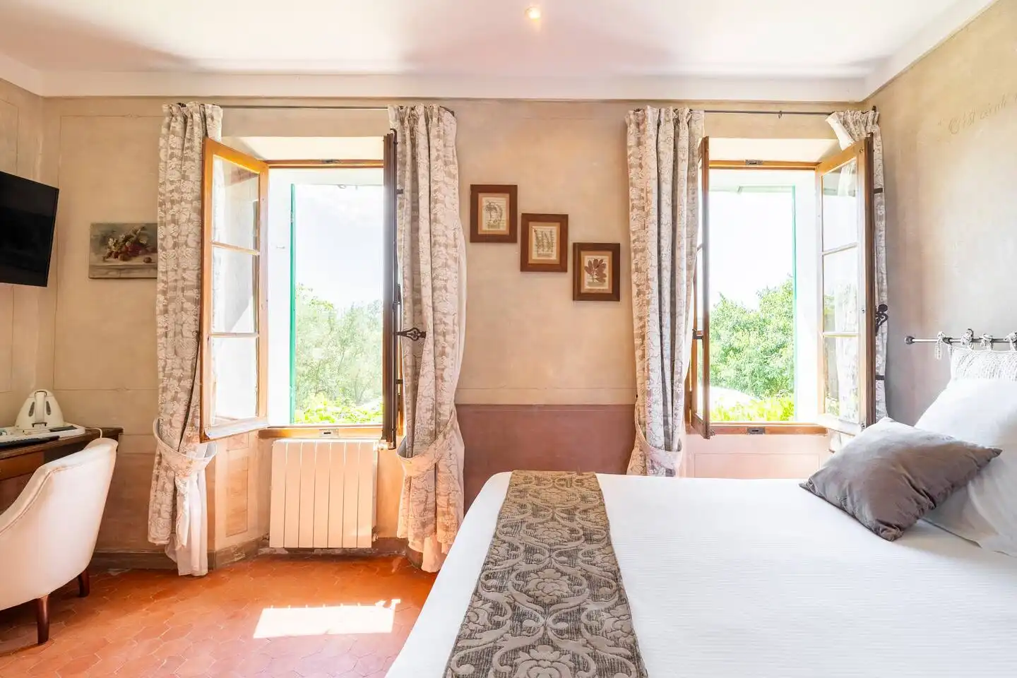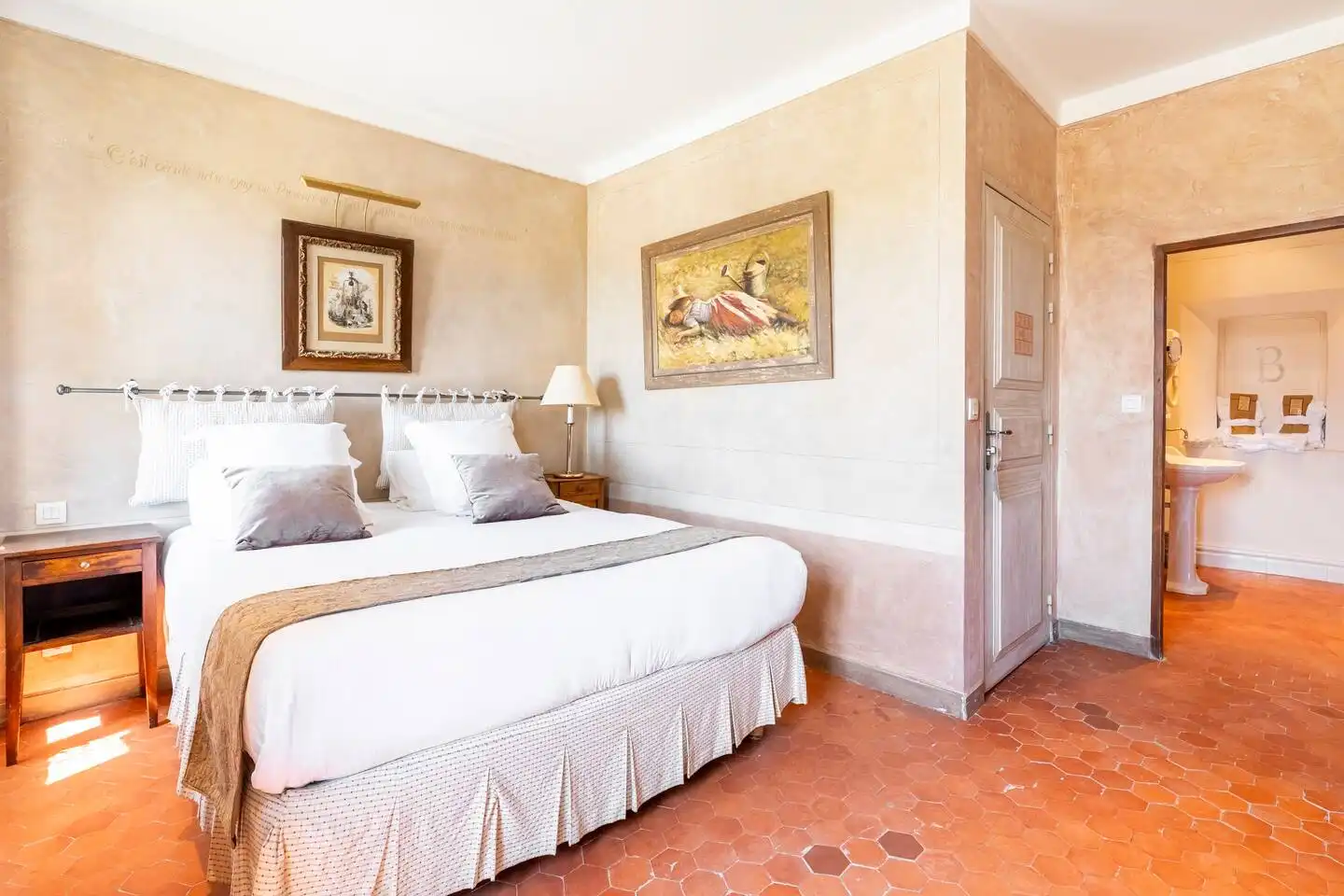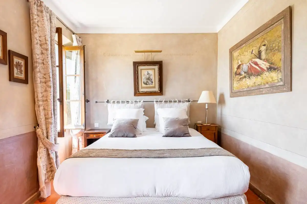 Notre chambre standard, les Herbes, vous offre son calme et sa chaleureuse ambiance provençale. Profitez de sa magnifique vue sur la piscine et la vallée de la Cadière d’Azur. La chambre mêle le charme authentique des tomettes provençales, du mobilier de bain rétro aux équipements de conforts actuels (climatisation, écran plat, WiFi).